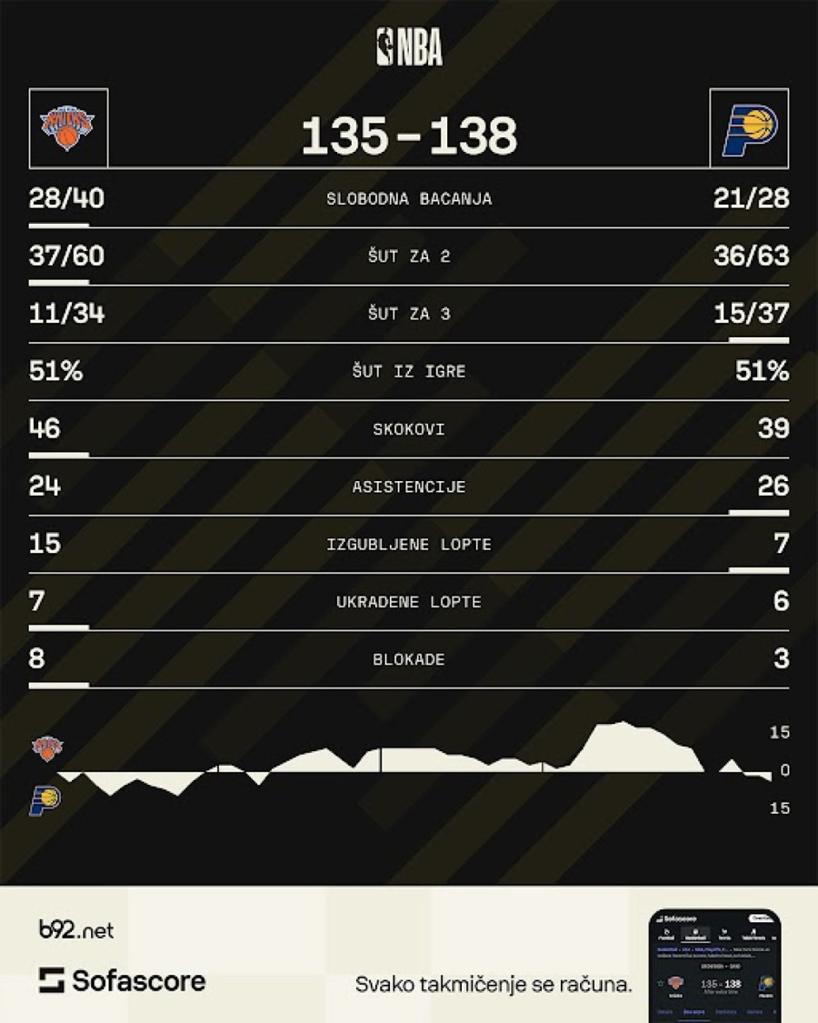 Indijanu su do pobede predvodili Tajris Haliburton sa 31 poenom i 11 asistencija i Eron Nesmit sa 30 poena.