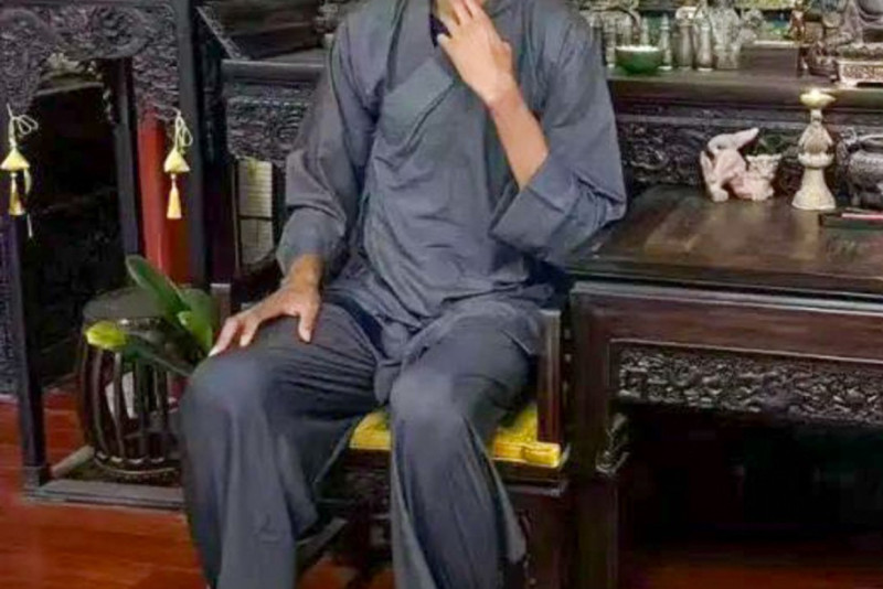 Na jednoj od najupečatljivijih fotografija vidi se kako 226 cm visoki centar sedi na kineskoj stolici ispred više skulptura Bude.