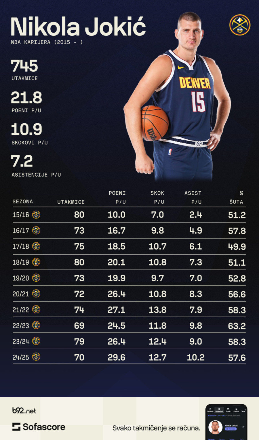Srbin je u Nagetsima otkako je draftovan 2014, a u poslednjih pet godina tri puta je proglašen za MVP-ja sezone, te za MVP-ja finala 2023.