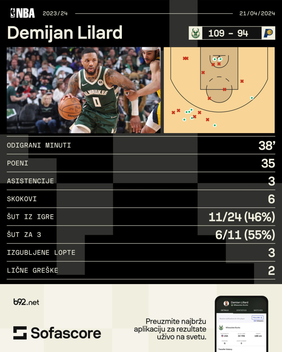 Demijan Lilard je od početka bio prva violina u igri Milvokija, koji je već na poluvremenu imao veliku prednost od 69:42.