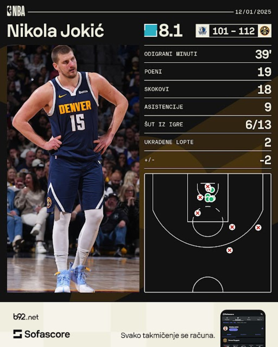 Malo po malo su Jokić, Vestbruk, Marej i Gordon uz Portera, Votsona, Strotera i ostale lomili Dalas i na kraju ga slomili. Nisu Maveriksi bez dva glavna igrača mogli da pariraju kompletnom Denveru i na kraju su Nagetsi zasluženo pobedili rezultatom 112:101.