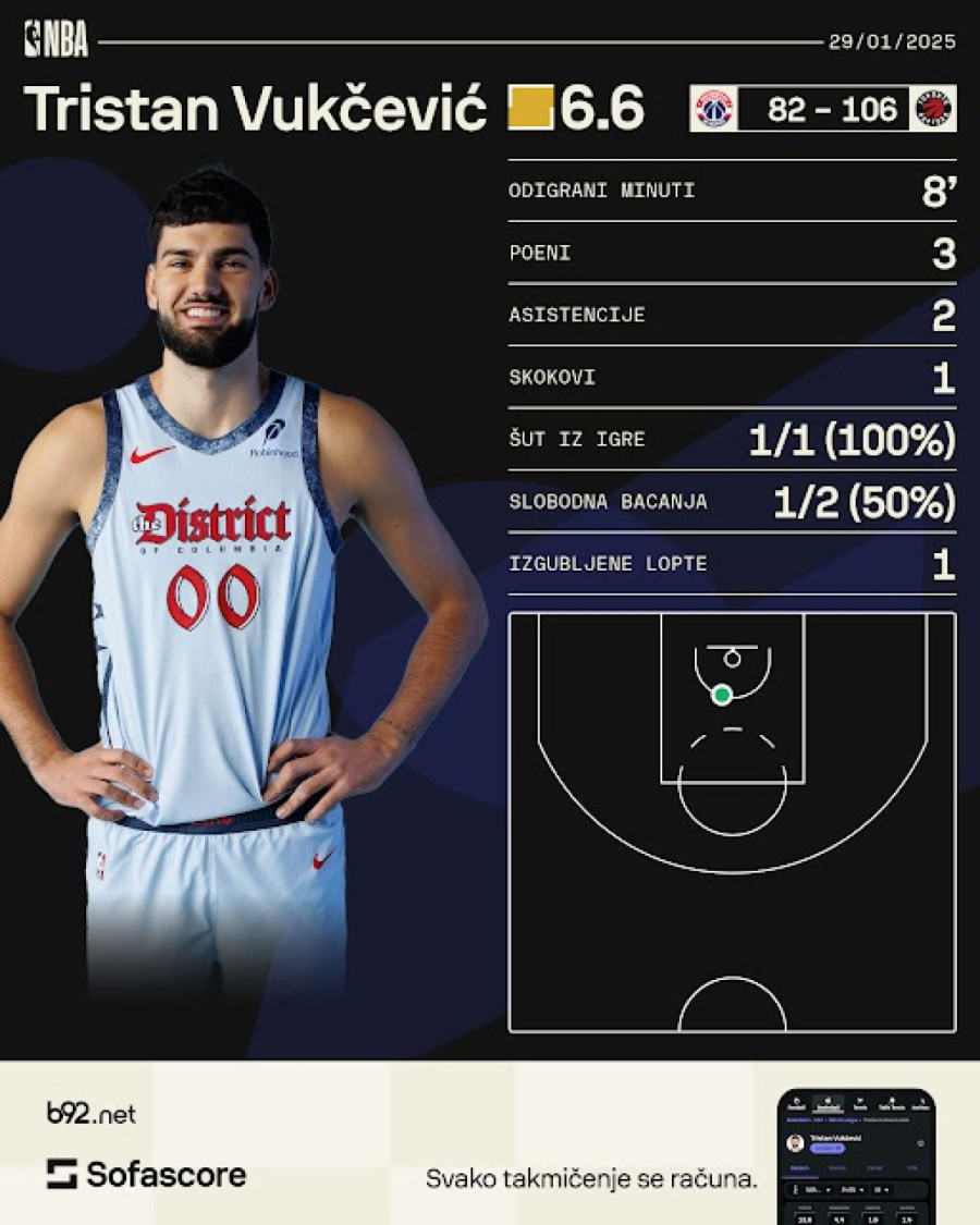 Srpski košarkaš Tristan Vukčević je u porazu svog tima postigao tri poena, uz dve asistencije i jednu uhvaćenu loptu.