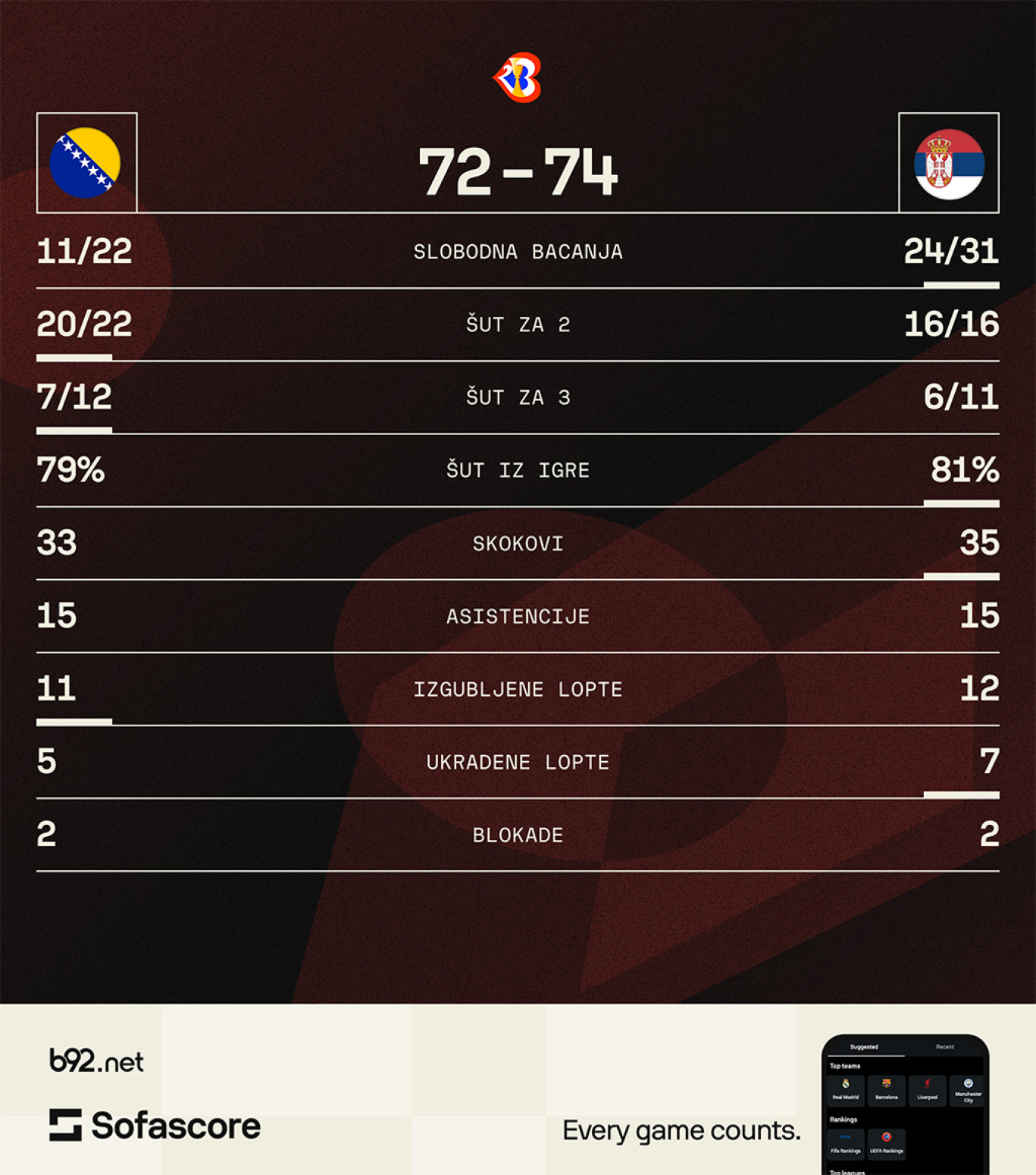 Košarkaška reprezentacija Srbije savladala je Bosnu i Hercegovinu u Sarajevu rezultatom 74:72 u utakmici drugog kola grupe C kvalifikacija za plasman na Svetsko prvenstvo 2027. godine.