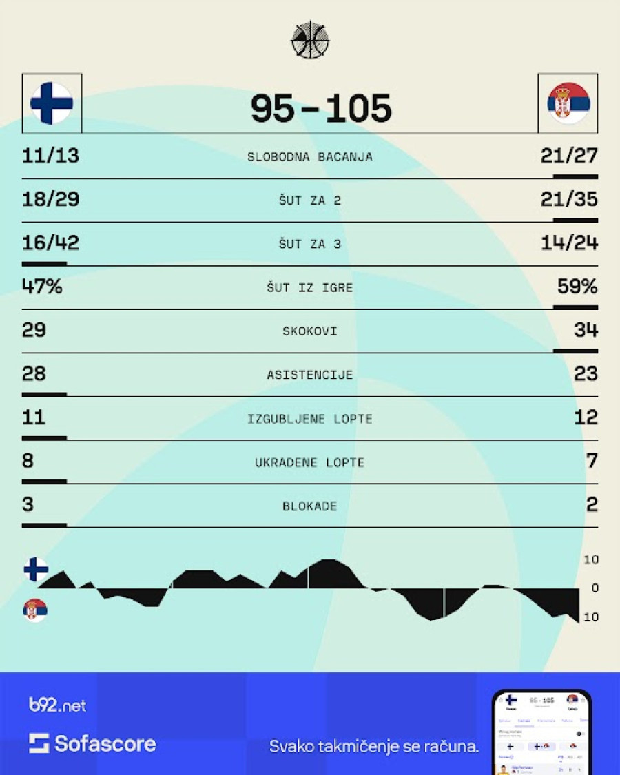 Uroš Trifunović i Dejan Davidovac postigli su po 12 poena, a u redovima Finske najbolji je bio Mikael Jantunen sa 18 poena, Olivije Nkamua je ubacio 17, a Sasu Salin dva manje.