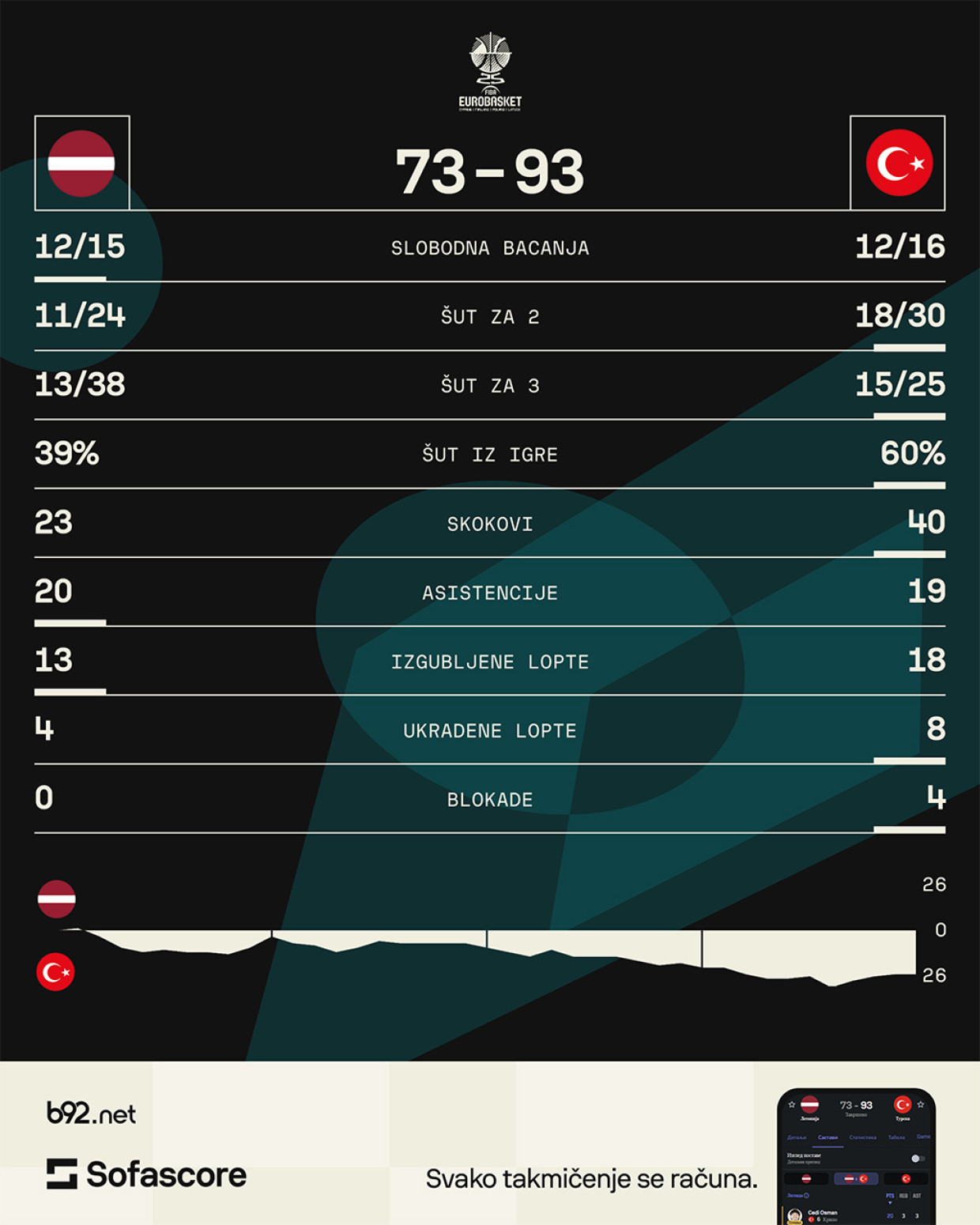 Najveća razlika je bila u poslednjoj deonici, čak +26 (62:88), što su Letonci ipak uspeli da ublaže u finišu i spreče potpunu katastrofu.