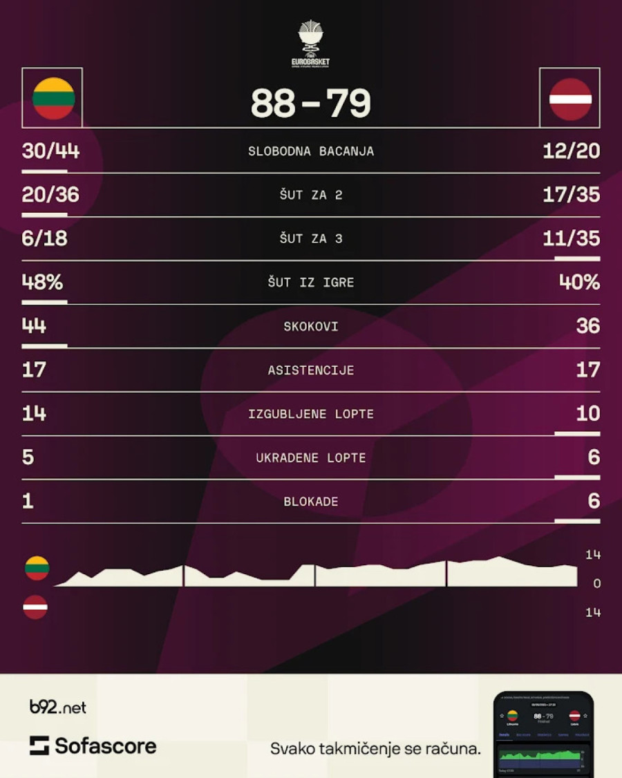 Ali ta nekonstantnost Letonije, koštala ih je boljeg rezultata na ovom meču. Jednostavno sve u ovom periodu išlo je na ruku Litvanije.