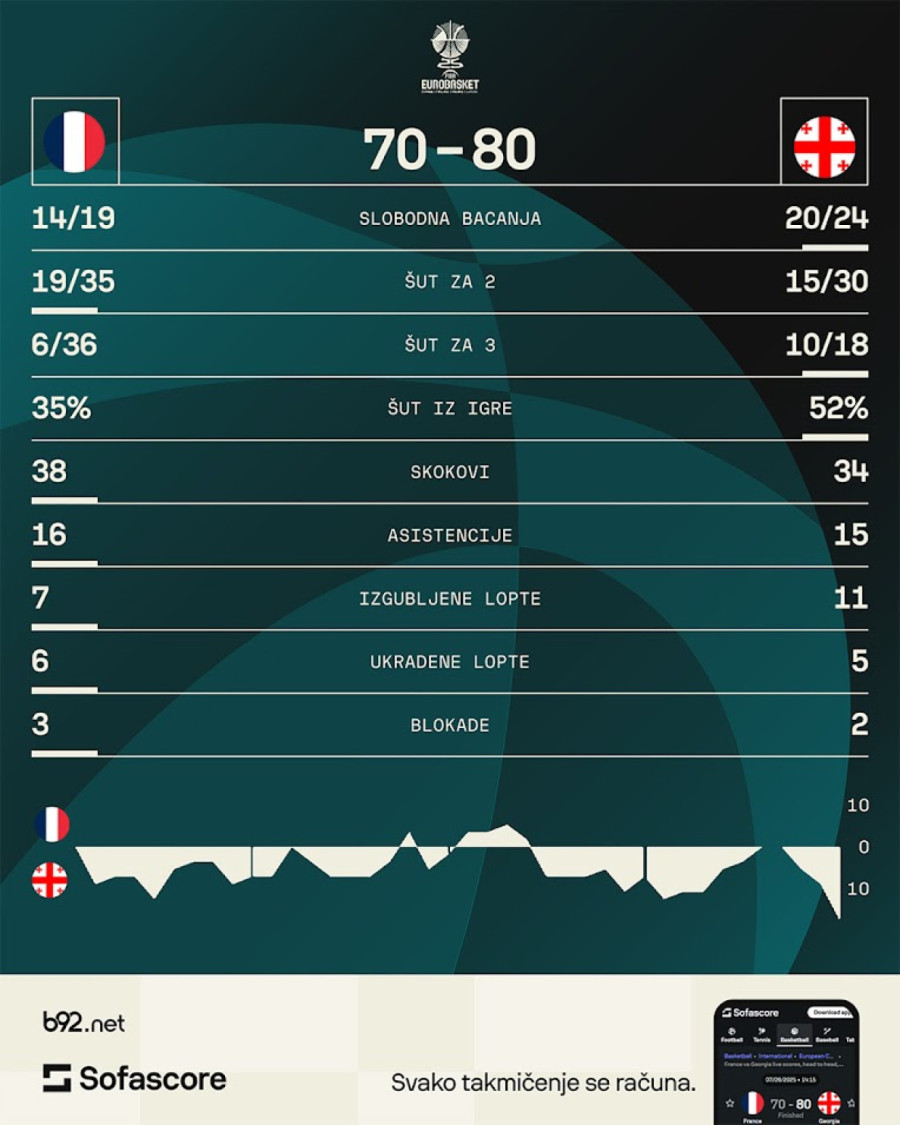 Razigrao se bio i Mamukelašvili posle snažnog zakucavanja, ali je Francuska ivek bila tu i nije dozvoljavala protivniku da se odlepi. Mahom jer su imali odličan ofanzivni skok.
