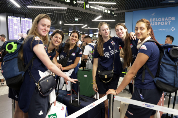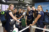 Na aerodromu "Nikola Tesla" u Beogradu fotografisane su raspoložene odbojkašice i članovi stručnog štaba Srbije uoči puta u Gvangdžou.