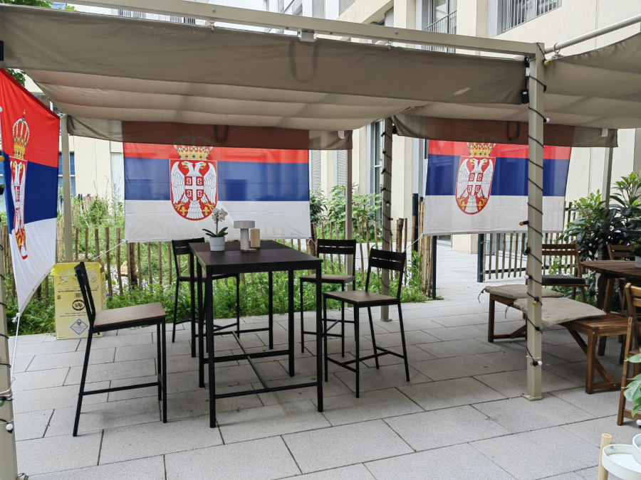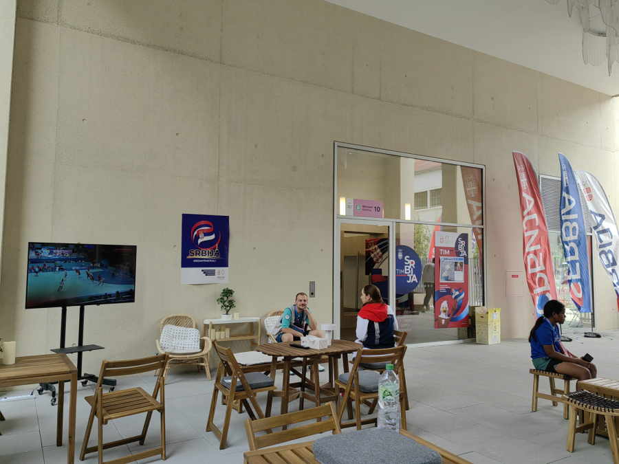 Na ulasku u srpski paviljon dočekala nas je srpska stonoteniserka Izabela Lupulesku, koja je trenutke odmora provodila u prostoru za sedenje na terasi.