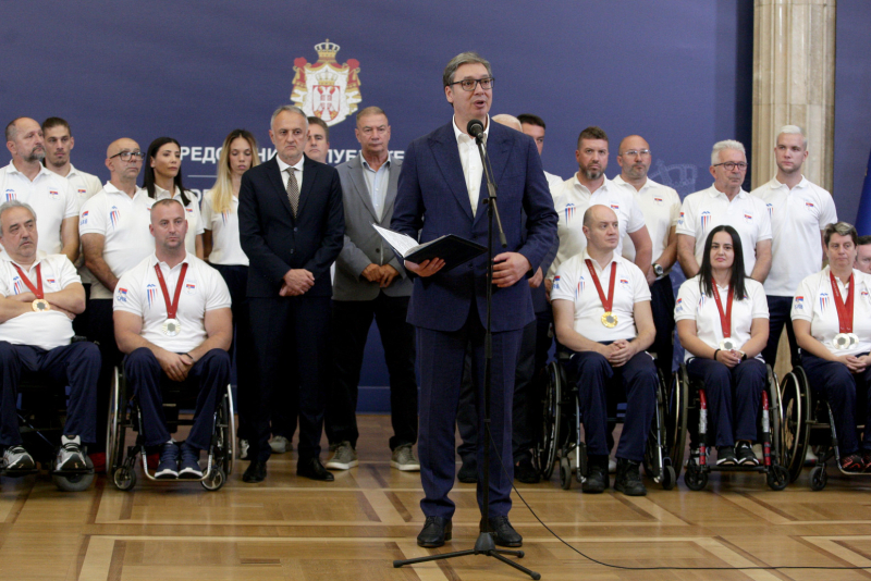 "Veliko hvala. Dobro došli. Da obeležimo fantastične rezultate, borbenost. Nikada toliko medijski nije bilo prikazano kako su se odigravale POI. Ponosan san na vas, na šest medalja. Ne samo na to, nego na svakog od vas koji ste učetvovali i što ste doneli Srbiji i svima nama. Viteški ste se držali, ostvarili ste rezultate i bićete zapamćeni od našeg naroda. I Dragana Ristića zlatna medalja je dokaz da nema nepremostivih prepreka. I Nebojši Đuriću na srebrnoj medalji, koju su mu oduzimali. Pokazao je kolika je snaga ljudskog duha. Draga Borislava, još dve medalje. Veliko hvala. Draga Nado Matić, uvek se pitam kako brzo možete da odigrate, da imate takve reflekse. Čestitam, znam koliko je truda rada, volje uloženo. Željko, bronzana medalja, neverovatna rešenost, legenda našeg olimpijskog tima. Mitar Palikuća, osvetlio je put mnogima koji će doći. Uložili smo novca, ne malo. Želim da vas obavestim da je danas Vlada donela odluku o isplati sredstava. Za zlato 200.000, za srebro 100, za bronzu 60 hiljada evra, isto onoliko koliko su osvojili olimpijci. Sešćemo, ne pred neko veliko takmičenje, već u narednih nekoliko nedelja i da razgovaramo o tome kako da nemate teškoća, kako da živite pristojno i kako da budete zadovoljni. Bole me priče da to finansiramo preko štapa i kanapa, a ja ovde ne vidim ni štap ni kanap... Sešćemo da dogovorimo kako da unapredite trenažni proces i da budete zadovoljni odnosom države... Mi smo na vas ponosni, na hrabrost istrajnost. Hvala vam što ste podigli zastavu Srbije na Panteonu sporta i postavili na mesto na koje pripada... Čestitam vam i beskrajno hvala na svemu. Živela Srbija", rekao je Vučić.