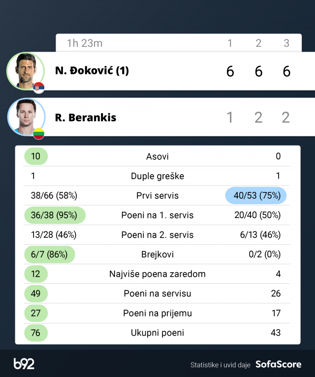 Đoković je i drugi meč zaredom izuzetno lako došao do pobede, ovog puta za samo sat i 23 minuta – 6:1, 6:2, 6:2.