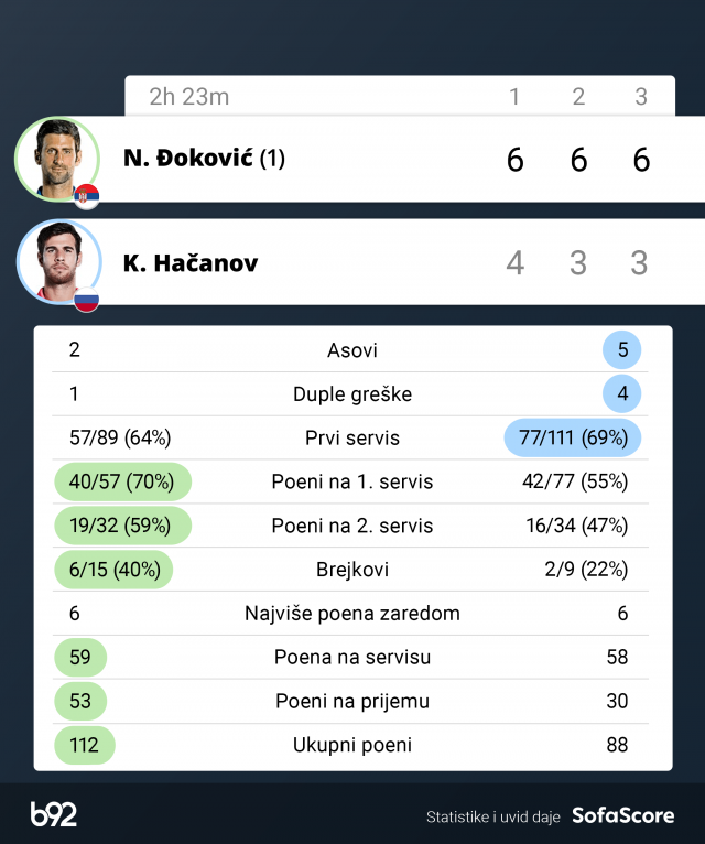 Odlično je servirao i Hačanov, spasao dve brejk lopte u šestom gemu, a najveći pritisak stigao je pri rezultatu 4:3 za Đokovića.
