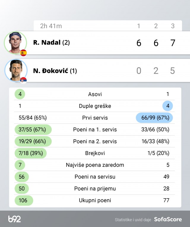 Većina poena koje je trebalo da dobije, odnosno koji su se razvijali tako da očekujete da ih Srbin osvoji, išlo je Nadalu.