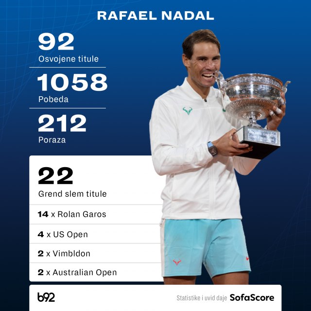 Nakon 14. Rolan Garosa sada ima 22 trofeja sa četiri prestižna teniska turnira. Po dva više od prvih pratioca Novaka Đokovića i Rodžera Federera.