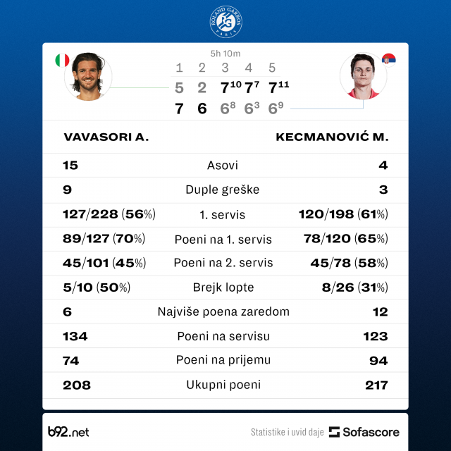 Vavasori je do meča sa Kecmanovićem stigao posle tri glatke pobede u kvalifikacijama, bez izgubljenog seta, a onda je slavio u maratonskom meču koji će ostati upamćen kao jedan od najdužih u Parizu.