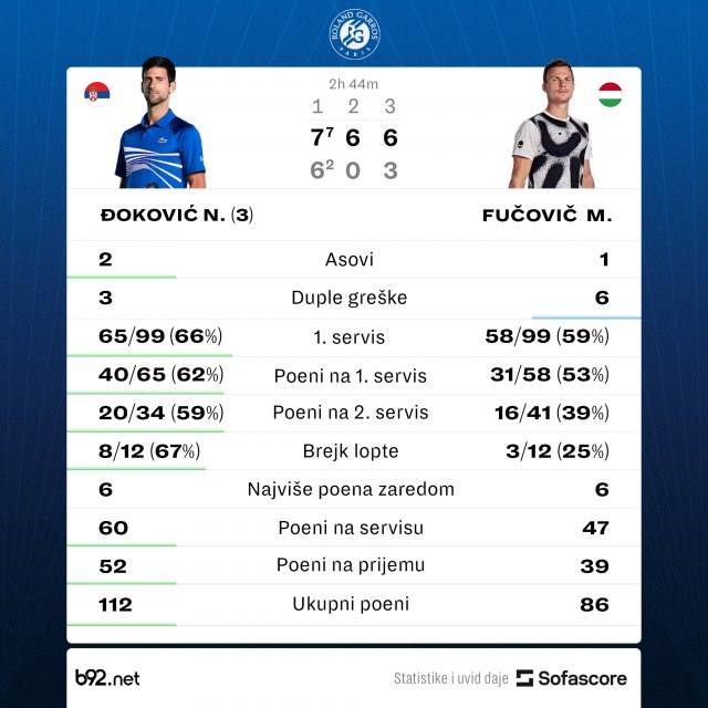 Treći nosilac u Parizu imao je dostojnog oponenta u Martonu Fučoviću, ali je na kraju posle 164 minuta igre slavio sa 7:6 (2), 6:0, 6:3.