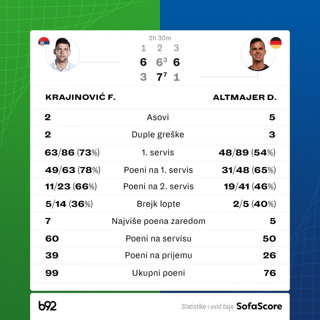 Krajinović je bio siguran u trećem setu, prepustio je Altmajeru jedan gem i plasirao se u osminu finala.