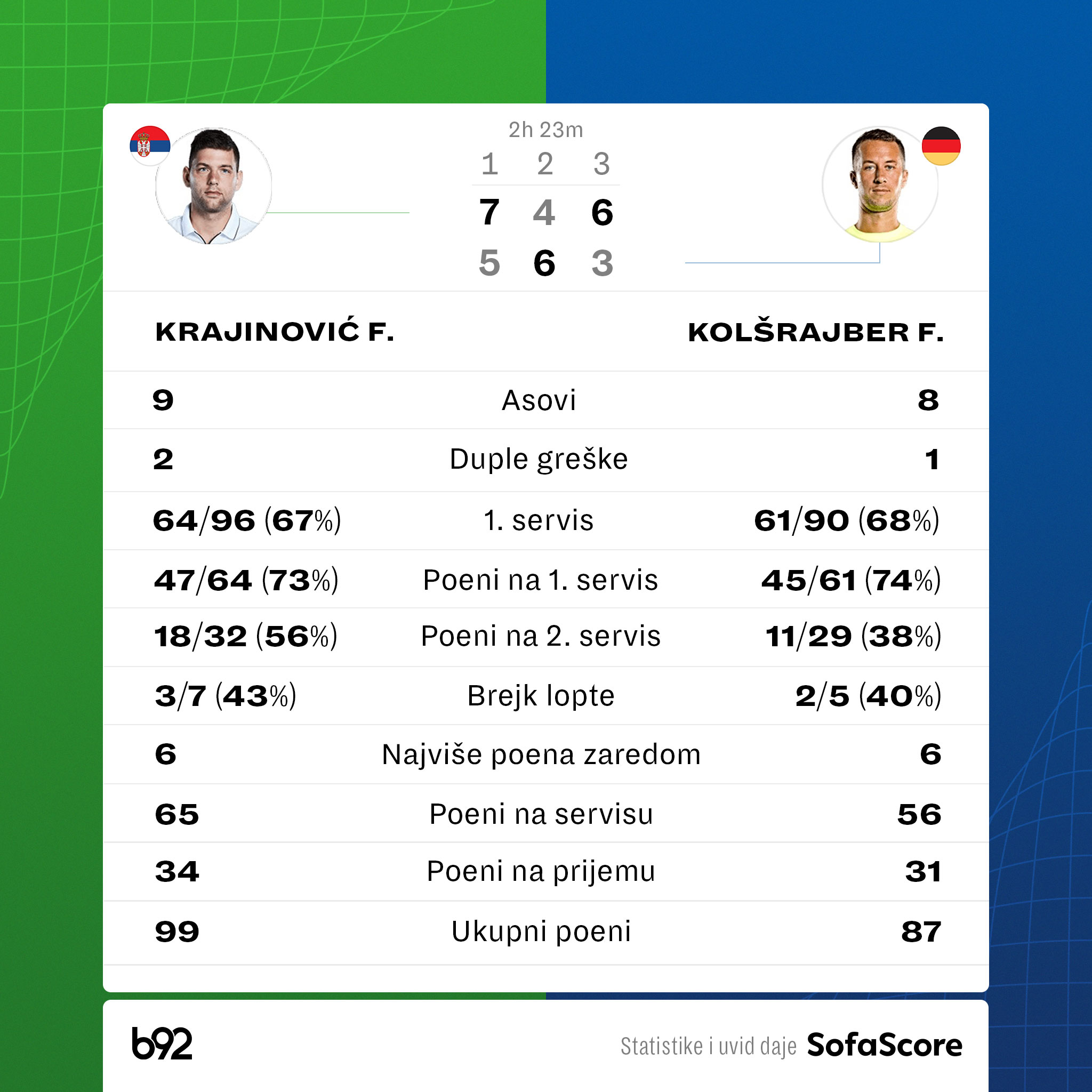 SNIzvor: B92, BetaŠesti nosilac je do pobede nad 117. teniserom sveta došao za dva sata i 25 minuta.