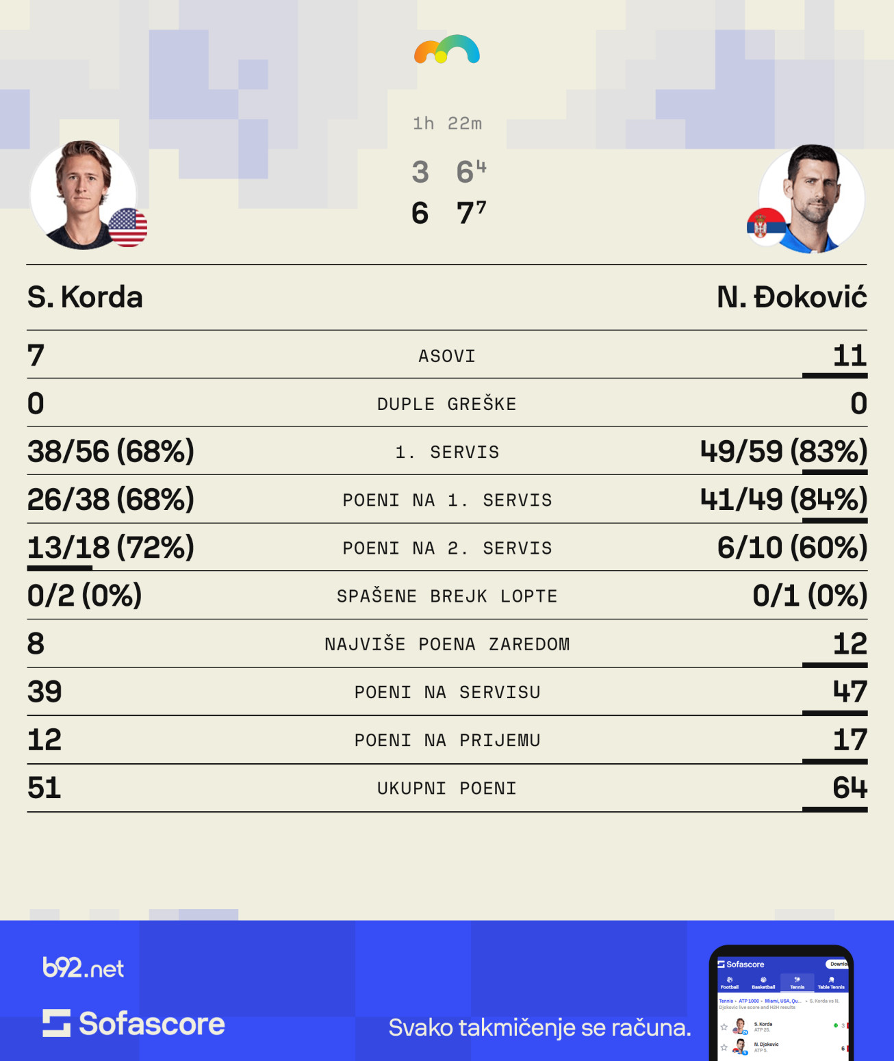 Korda nije posustajao sa servisima, već je krupnim koracima grabio ka osvajanju drugog seta, ali se Đoković pojavio ponovo u pravi čas.