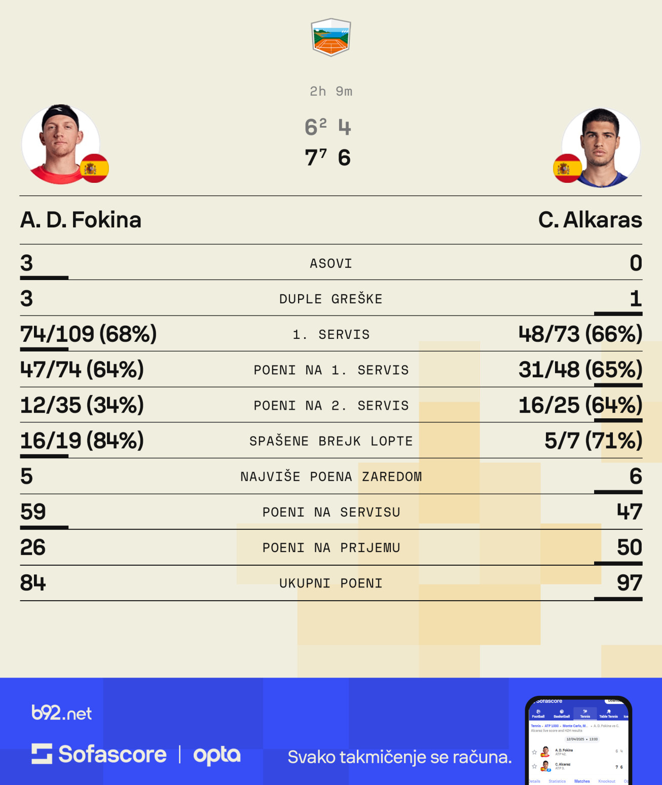 Alkaras je i u trećem gemu imao čak šest brejk lopti, kojima nije uspeo da slomi, dotuče rivala. Imao je kasnije, u devetom gemu još četiri, ovoga puta meč lopte, ali je Fokina uspeo da "preživi".