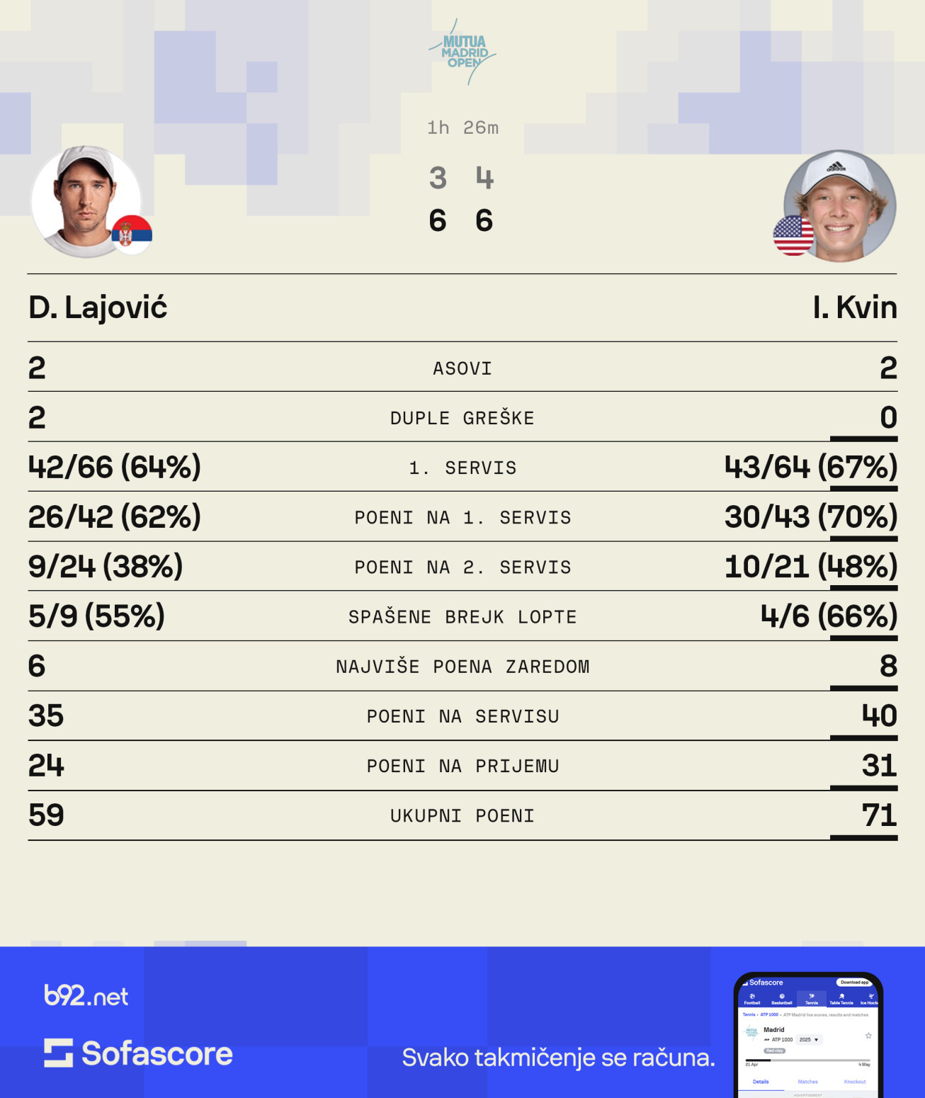 Lajović je dobro započeo duel, brejkom, ali je Kvin potom napravio dva i tako poveo na ovom susretu.