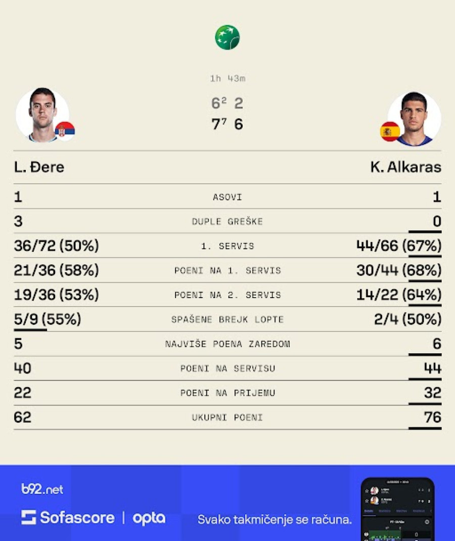 A tamo, postojao je samo jedan igrač. Bez ikakvih problema Alkaras je rešio taj-brejk, dozvolio je Đereu samo dva poena i posle sat igre iskoristio je prvu set loptu.