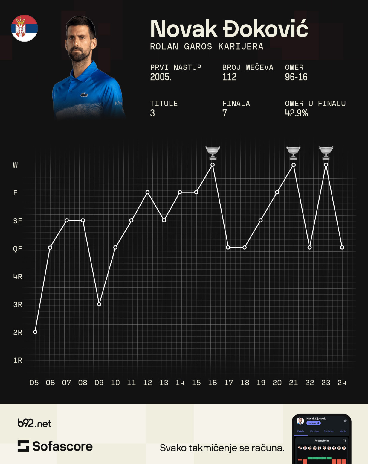 Ovaj Rolan Garos će mu biti 21. u karijeri, ukupno 78. grend slem. Na prošlom, u Melburnu, stigao je do polufinala.