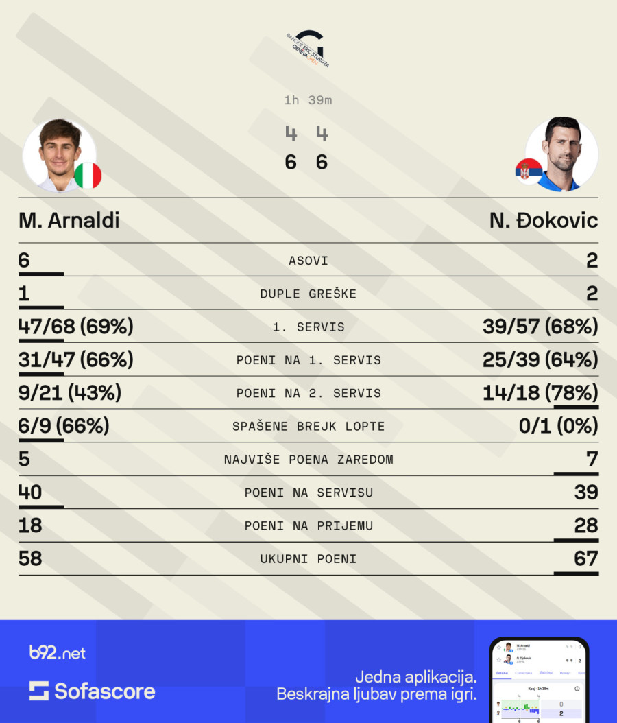 Đoković je napravio dve duple greške, poklonio brejk Arnaldiju i Italijan je brzo poveo 3:1, pa čak i 4:1 na svoj servis.