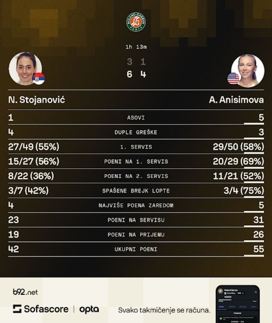 Srpska teniserka Nina Stojanović završila je nastup na Rolan Garosu, pošto je u prvom kolu predala duel Amerikanki Amandi Anisimovoj.