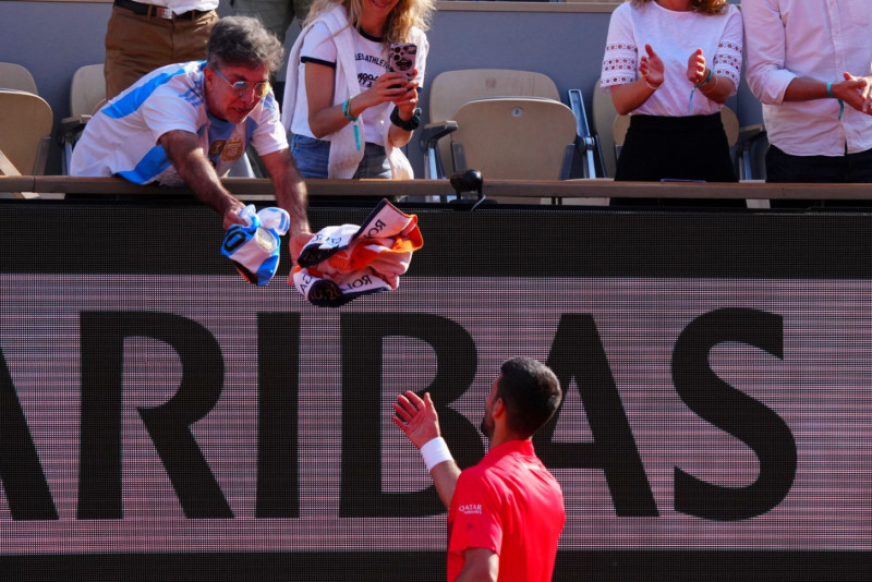 Gde god da igra, ljudi iz svih krajeva planete dolaze da ga podrže, pa je to slučaj i na Rolan Garosu. Jedan gospodin iz Argentine je i u Pariz, kao i prethodno u Ženevu, došao sa dresom na kojem je, uz broj 10, slika Novaka i Lea Mesija.