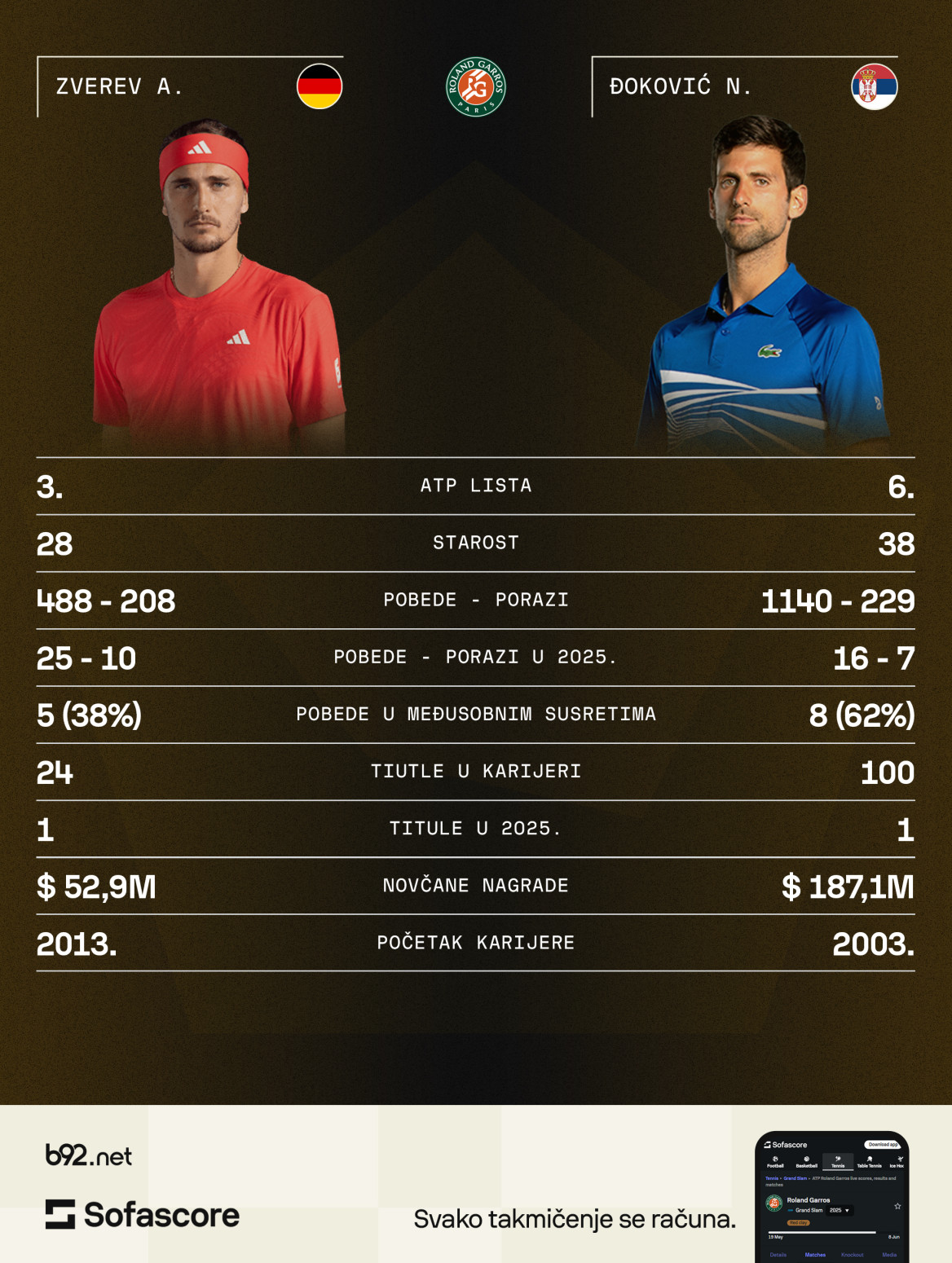 Zverev je treći teniser sveta, dok se Đoković nalazi na šestom mestu ATP liste.