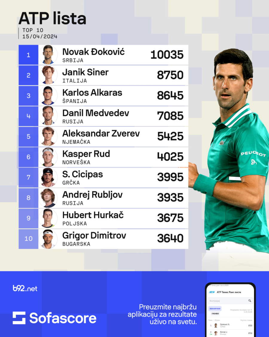 Đoković je u Monte Karlu stigao do polufinala i zaradio 310 poena, tako da na najnovijoj ATP listi ima 10.035 poena.