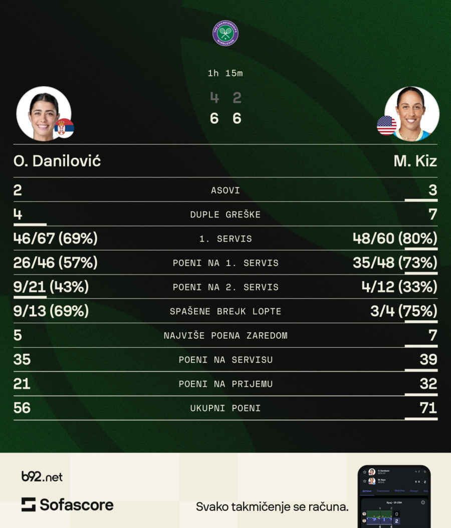 Ipak, Kiz je u završnici seta igrala sigurno, te Srpkinja nije uspela da poremeti ritam grend slem šampionke i završila je učešće u Londonu.