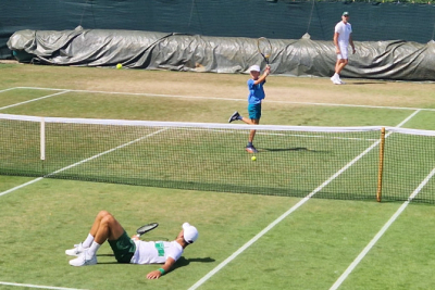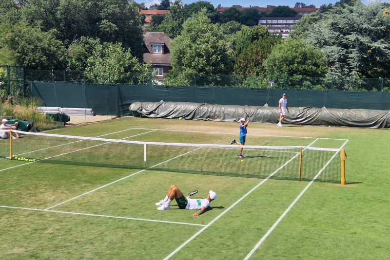 Petak, 14 časova, 24 stepena, London, Vimbldon. Novak Đoković udara tenisku lopticu na vimbldonskoj travi. Prvo sa Flavijom Kobolijem, pa sa svojim timom, pa sa sinom Stefanom...