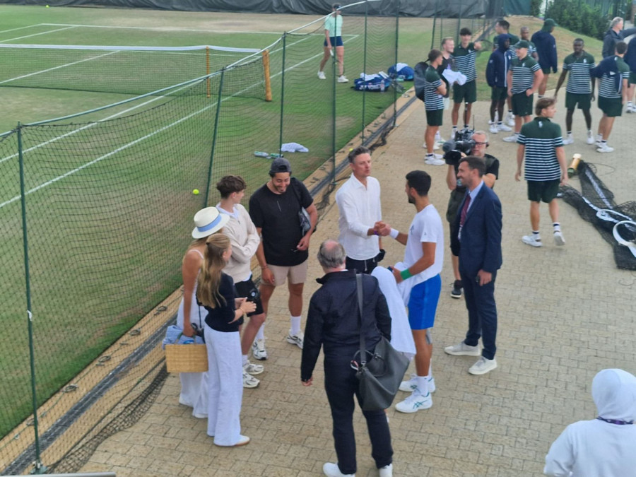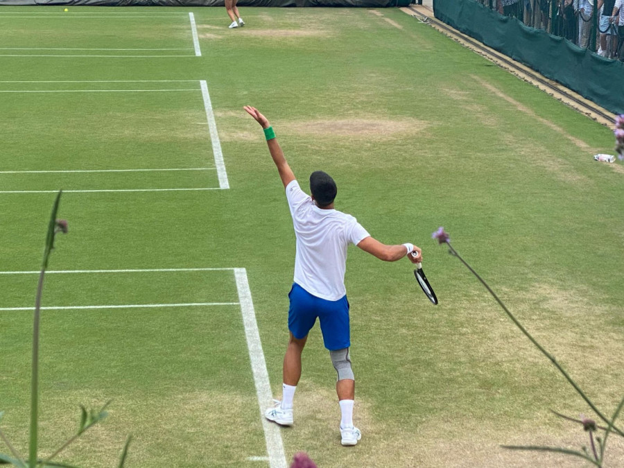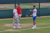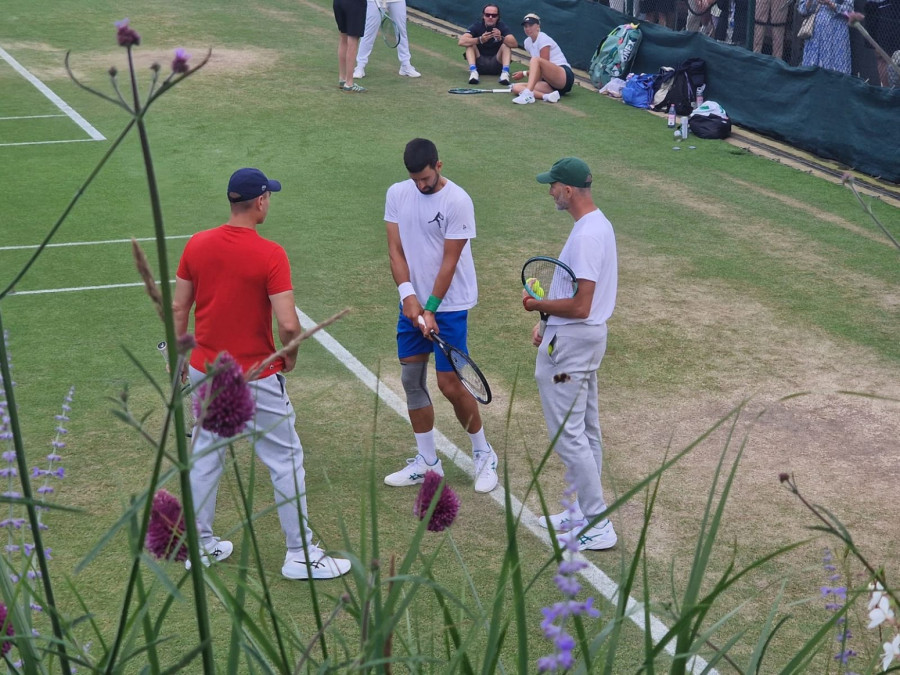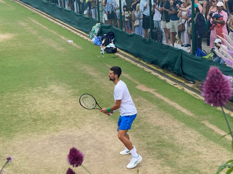 Srpski teniser Novak Đoković naposletku je, barem nakratko, dobio priliku da napolju odradi trening pred sutrašnje polufinale Vimbldona.