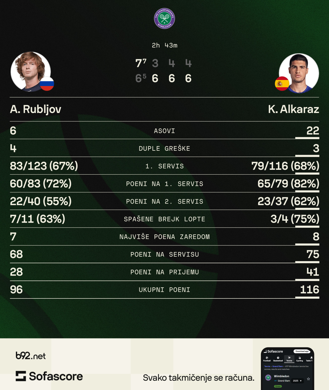 Ubrzo je Rubljov potvrdio brejk, došao do 4:1 i onda se naprosto ugasio. Ili je, pak, Alkaras ubacio u veći stepen prenosa.