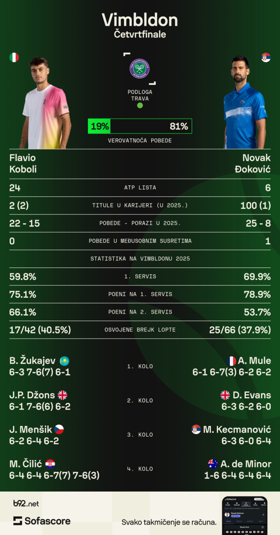 Đoković protiv Italijana – borba za polufinale Vimbldona