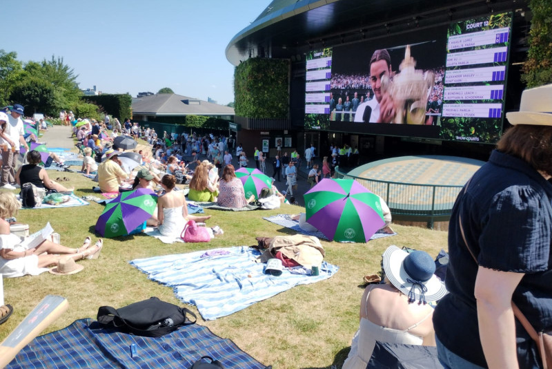 Tu će, kao i svaki dan do sada, na ogromnom ekranu koji je okačen na Teren 1 biti prikazivani svi mečevi polufinala, a ljudi su odmah doneli peškire, sendviče, piva i ostale đakonije, ali i što je najvažnije – suncobrane.