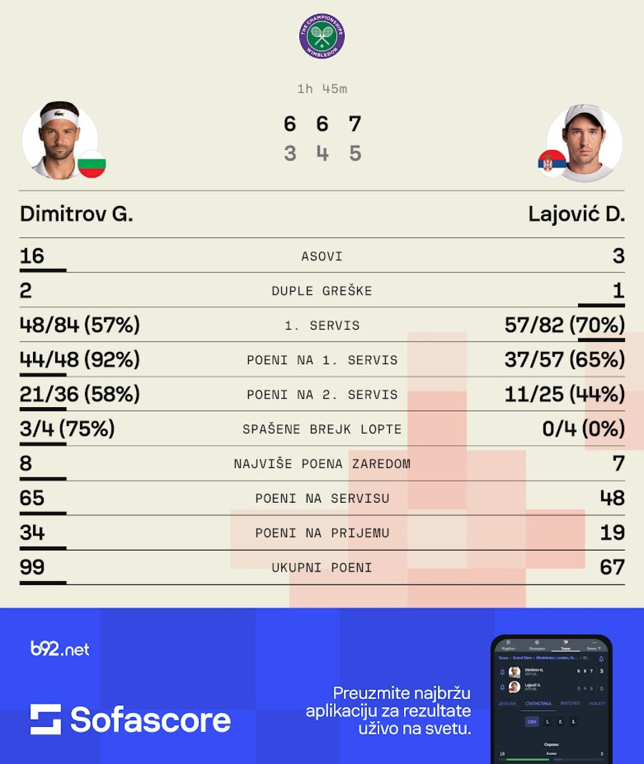 Lajović se ubrzo upisao, ali nije bio ni blizu neke brejk lopte, pošto je Dimitrova i te kako služio servis.