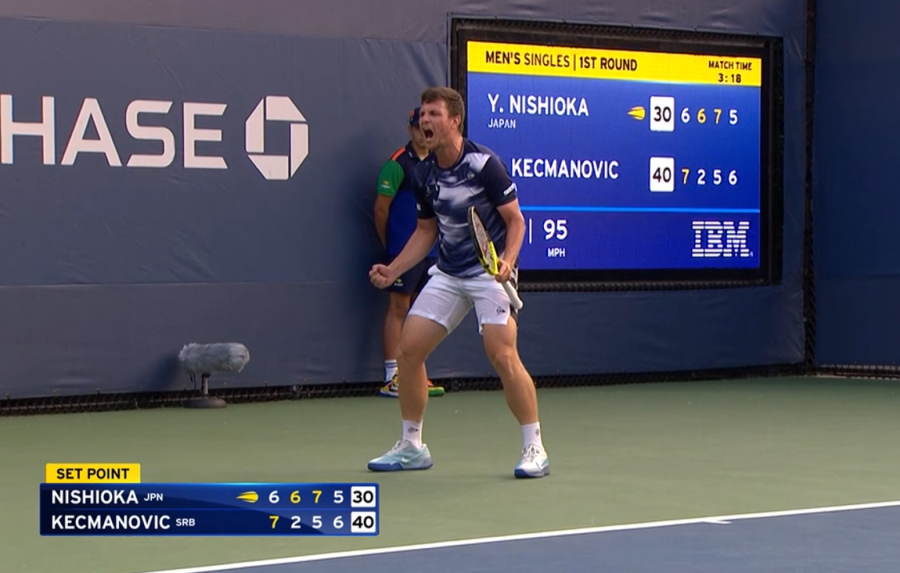 Ipak, u narednom gemu nije iskoristio gem loptu i Nišioka je ponovo poveo, ali tu nije bio kraj drami. Kecmanović je u desetom gemu četvrtog seta došao do brejk lopte – međutim, usledio je as.