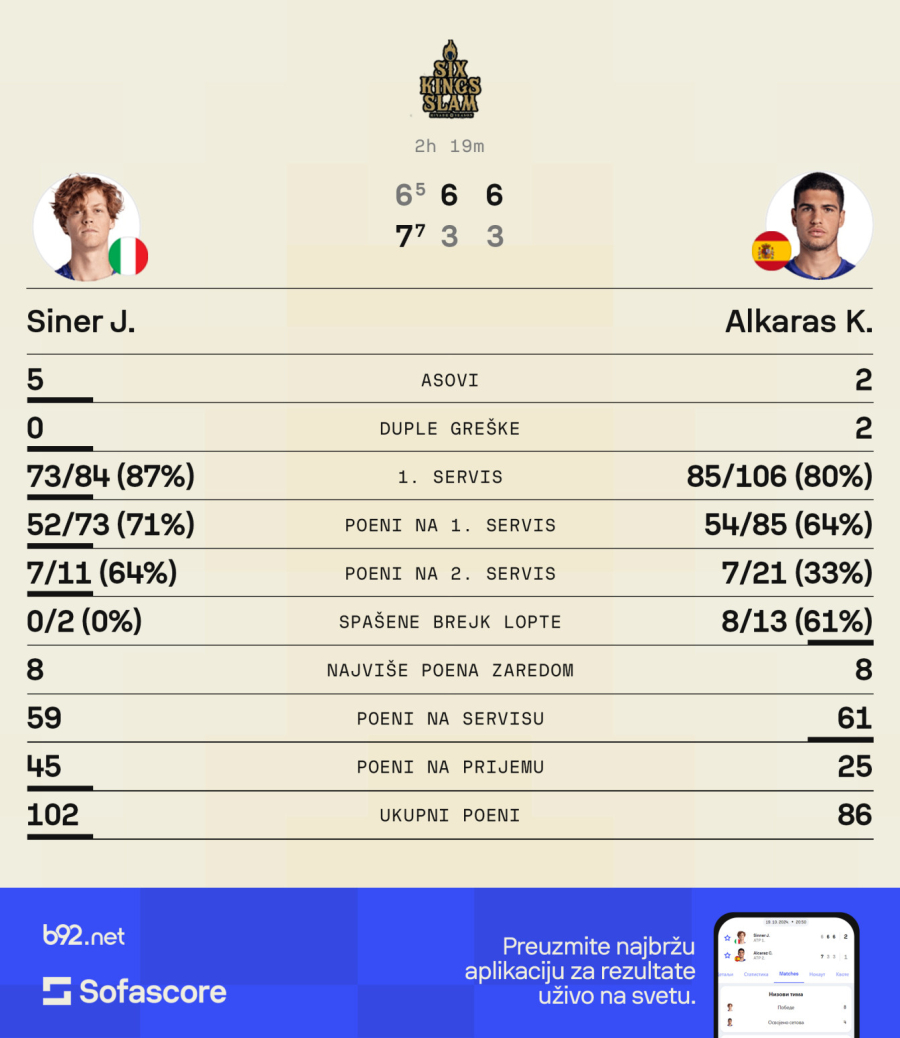 Alkaras je uspeo da izbori taj-brejk i u njemu da slavi, a Siner reagovao burno. Svakako, ne u skladu sa prirodom turnira što i jasno pokazuje koliko je želeo pobedu na ovom meču.
