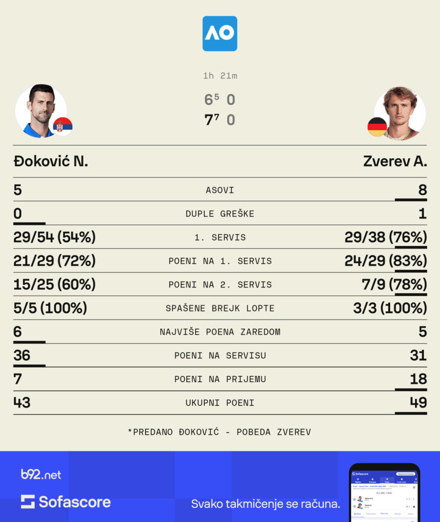 Ovako je meč otišao u taj-brejk gde je Zverev uspeo da slavi 7:5, a i pre toga očigledno povređeni Novak je odmah po okončanju poslednjeg poena ostao na terenu i prišao mreži kada je saopštio svoju odluku protivniku.