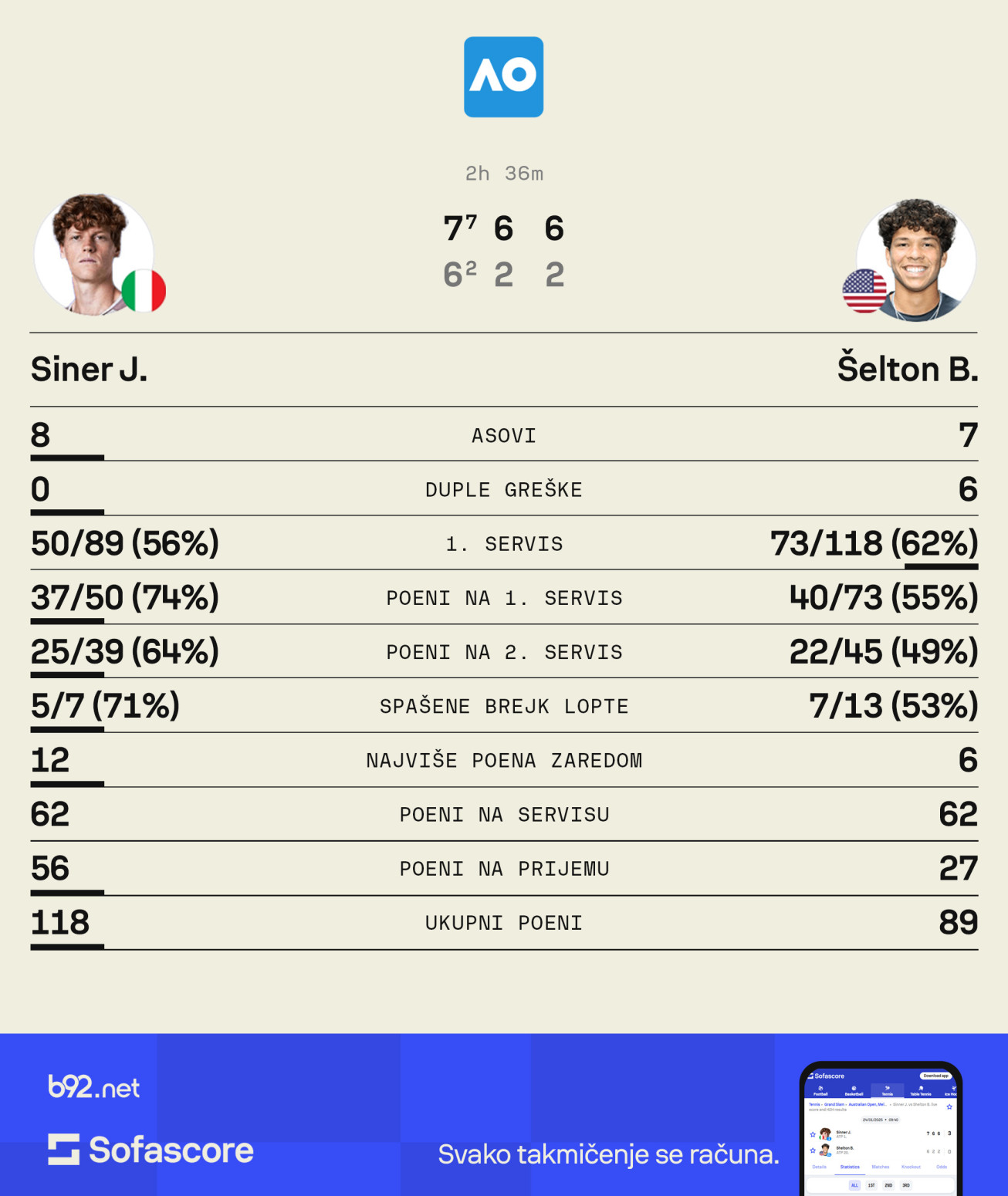 Siner, prvi na ATP listi je uspeo da savlada Amerikanca Bena Šeltona, koji je 21. na svetu sa 3:0, po setovima 7:6(2), 6:2, 6:2 za dva sata i 38 minuta igre.