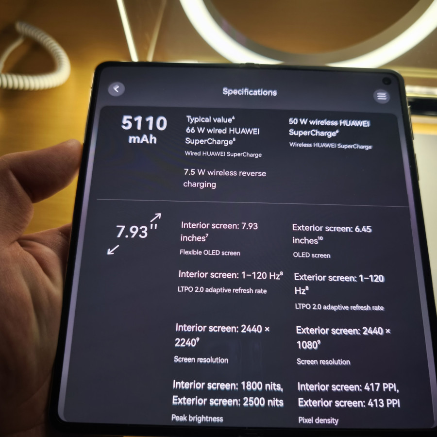 Glavni ekran je LTPO i ima dijagonalu od 7,9 inča, dok je spoljašnji dijagonale 6,54 inča i Huawei kaže da ima osvetljenje od 2.500 nita što je prilično impresivno.