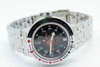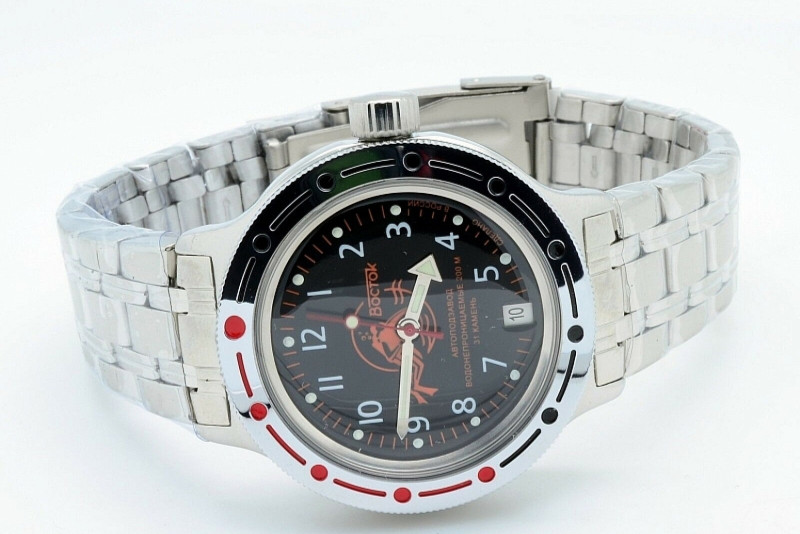 Ciferblat je mat crne boje, sekundara je crvena sa ilustrovanim narandžastim roniocem i natpisom koji na ruskom jeziku navodi vodootpornost i ime marke.