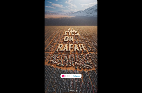 Slika kreirana pomoću veštačke inteligencije (AI), na kojoj je napisan slogan ''Sve oči uprte u Rafu'', postala je viralna na društvenim mrežama.