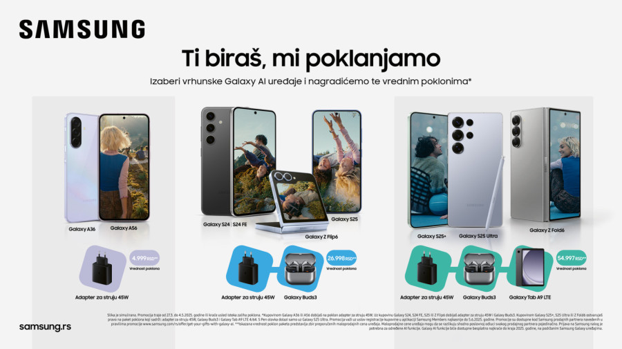 Oni koji se odluče za Galaxy S24, S24 FE, Z Flip6 ili S25 na poklon dobijaju 45W strujni adapter i Galaxy Buds3 slušalice. Korisnici koji kupe Galaxy S25+, S25 Ultra ili Z Fold6 će dobiti 45W strujni adapter, Galaxy Buds3 slušalice i Tab A9 LTE.