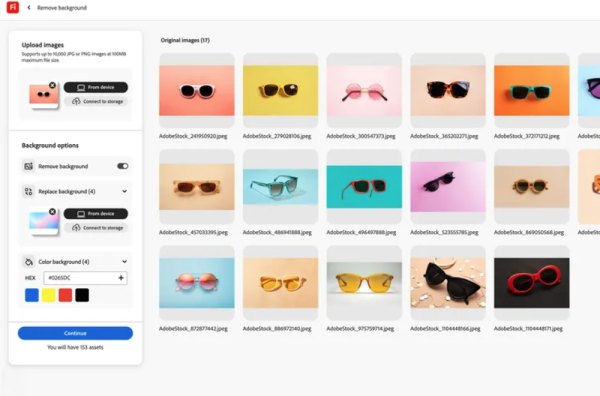 Bulk Create se danas pokreće u beta verziji i podeljen je na dva odvojena alata u Adobe Firefly web aplikaciji: "Remove Background" i "Resize". Prvi je prilično razumljiv već po imenu – korisnici mogu da otpreme slikovne datoteke u alat sa svog računara, Dropboxa ili Adobe Experience Managera i brzo uklanjaju pozadinu.