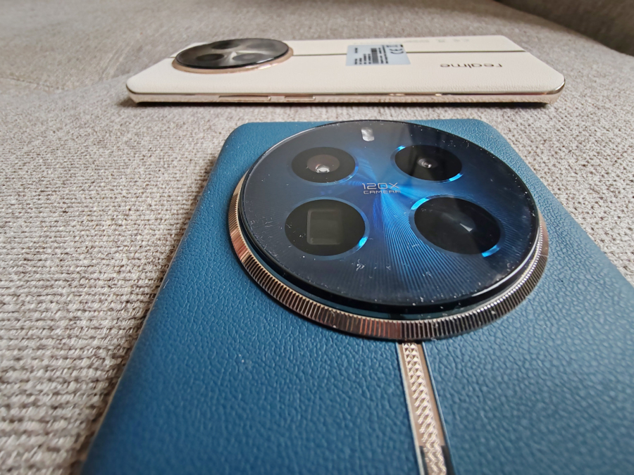 Pozadina realme 12 Pro 5G i 12 Pro+ 5G uređaja je ono što će im, po našem mišljenju, biti pored kamera glavni adut. Izrađena je od eko kože, čija se mekana tekstura oseća pod prstima, a po sredini prolazi traka u zlatnoj (odnosno srebrnoj) boji. Sistem zadnjih kamera smešten je u kružni okvir - dve gore, i dve dole.