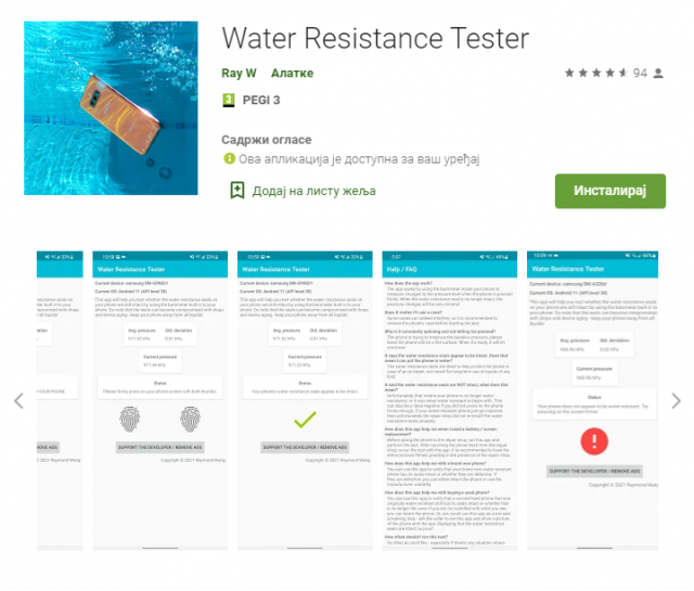 Programer Ray Vang kaže da je kreirao aplikaciju kako bi pomogao ljudima da provere stanje vodootpornog zaptivanja svojih uređaja nakon popravke jer uređaji sa vremenom propadaju. Očigledno je da ne uzimate prolaznu ocenu "zdravo za gotovo" kako biste bacili telefon u jezero. Međutim, na osnovu povratnih informacija korisnika Reddita i recenzenata Play prodavnice, čini se da je aplikacija pouzdana. Galaxy Note 20 Ultra, ocenjen IP68, isprva je prošao test, ali kada je izvađeno ležište za SIM karticu, nije uspeo - kao što biste očekivali. TCL 20 Pro 5G, koji nema IP ocenu, nije uspeo.